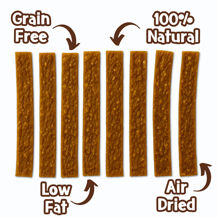 Air-dried strips of delightful chewy yumminess! Our plant powered recipe is Grain-Free, Rawhide-Free, and Low in Fat. The ultimate long-lasting treat!