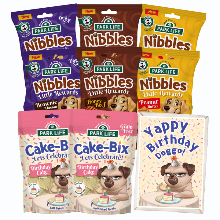 Celebrate your Pups Birthday in style with this Birthday Bundle and FREE Card or Gotcha Day as these are suitable from 8 weeks old. The soft baked Heart shaped Cake-Bix and the yummy New Nibbles little rewards in three tasty flavours will set your dogs tail wagging for more! Go Shorty, it's your birthday.