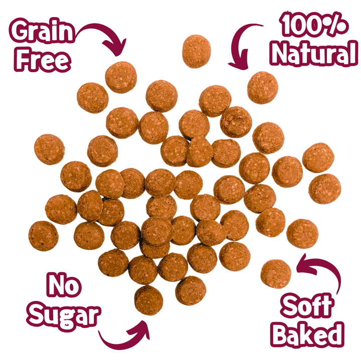GRAIN FREE, 100% NATURAL, HUMAN QUALITY GUT FRIENDLY, NATURAL SOURCE OF PROTEIN, OVEN BAKED IN SMALL BATCHES, NO ADDED SUGAR OR SALT, PUPPY FRIENDLY.